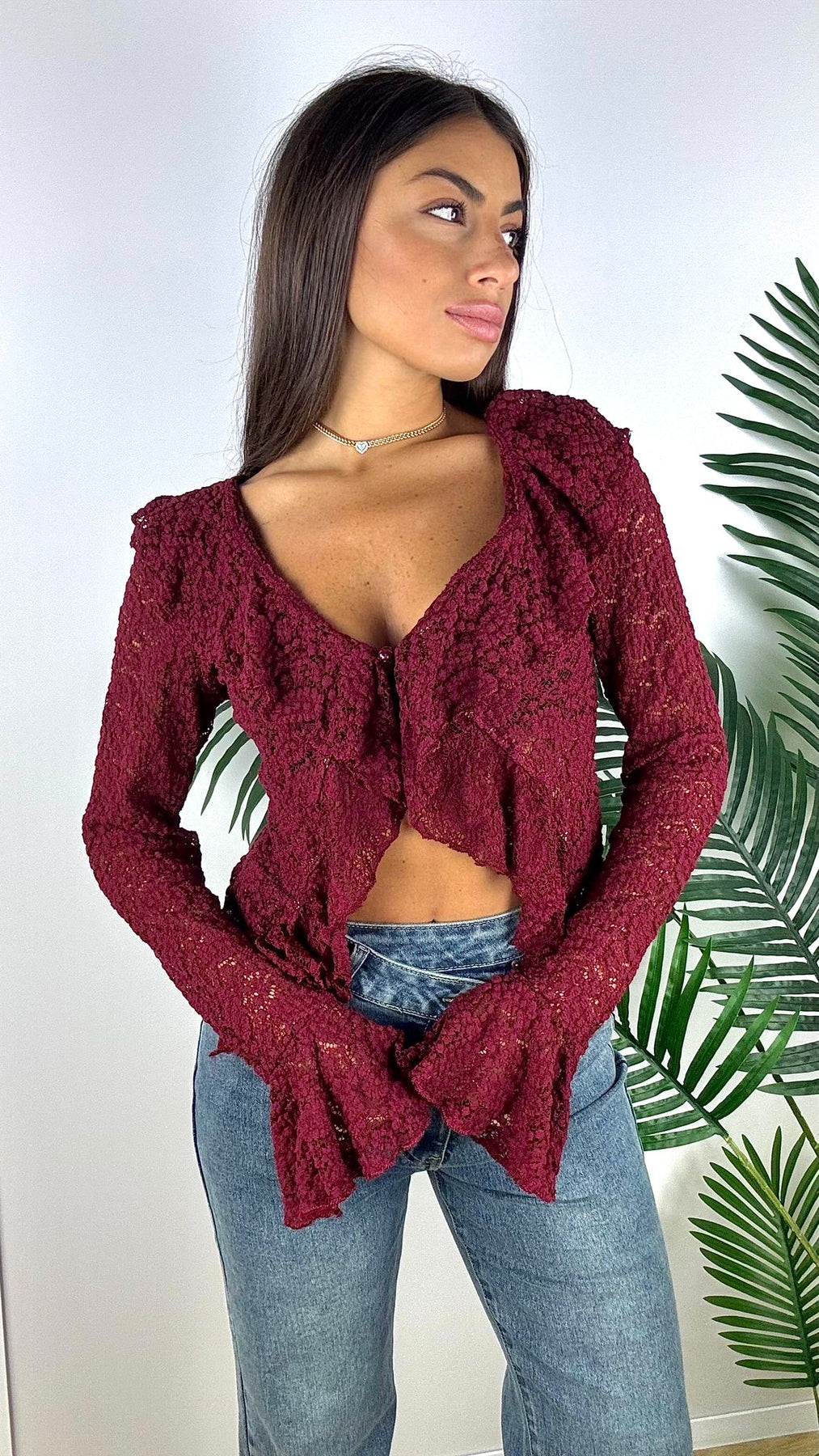 - Maglia donna in pizzo lavorato color bordeaux, dal design elegante e raffinato. Caratterizzata da scollo a V e maniche lunghe svasate, presenta una chiusura frontale che la rende pratica e femminile. Il tessuto leggero e ricercato valorizza la silhouette, perfetto da indossare sia con jeans per un look casual chic, sia con gonne o pantaloni eleganti per occasioni speciali.