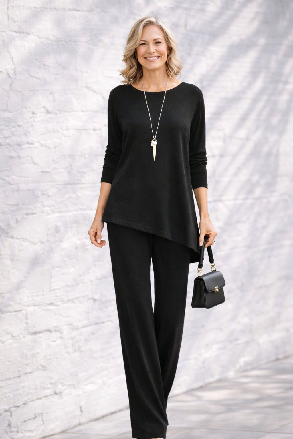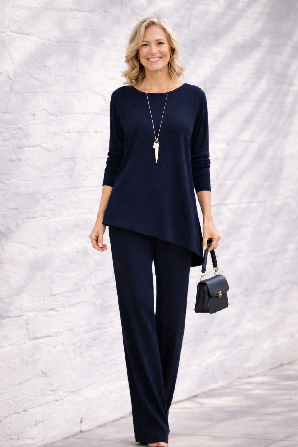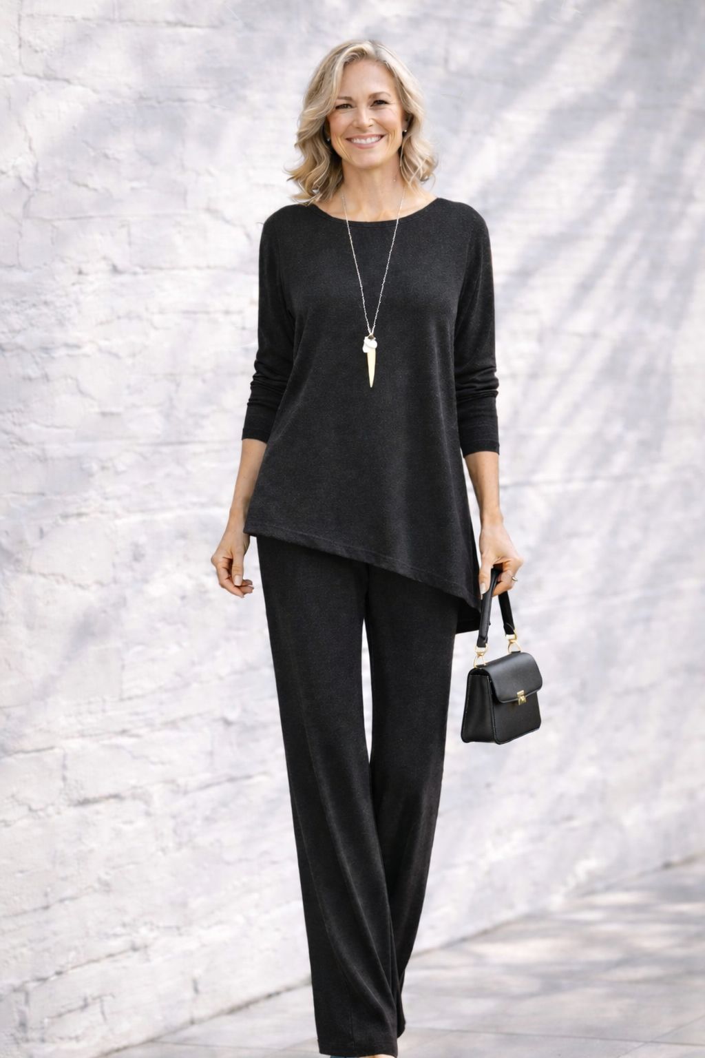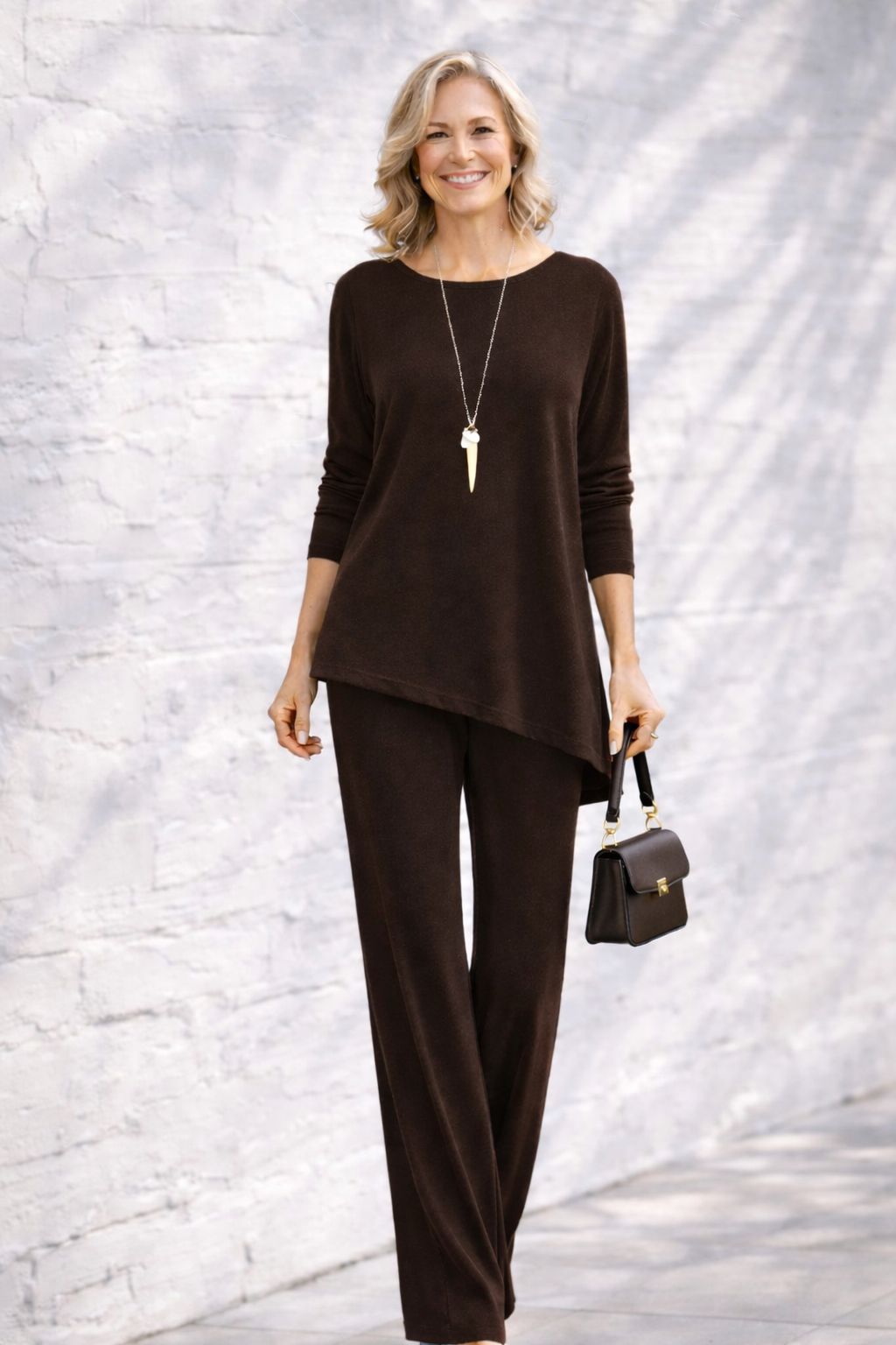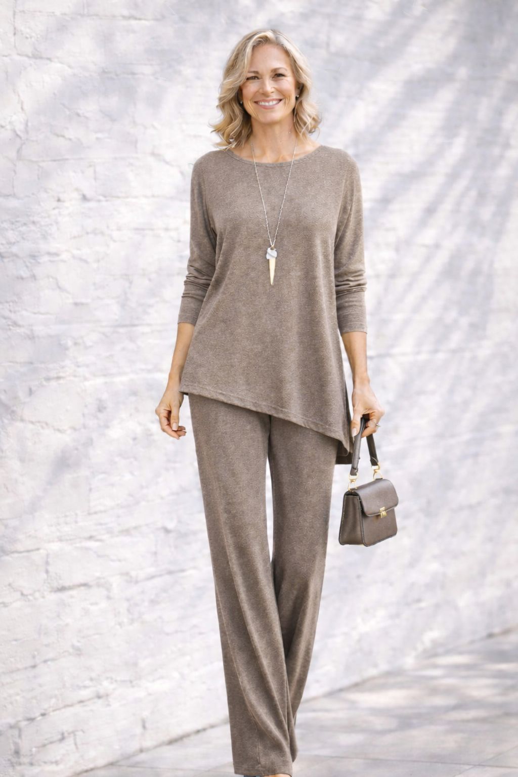 La maglia ampia con scollo ampio cade morbida sul corpo e regala un tocco di eleganza senza sforzo, mentre i pantaloni in coordinato completano il look con linee fluide e contemporanee.