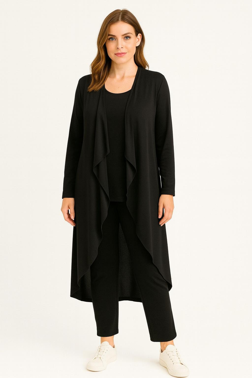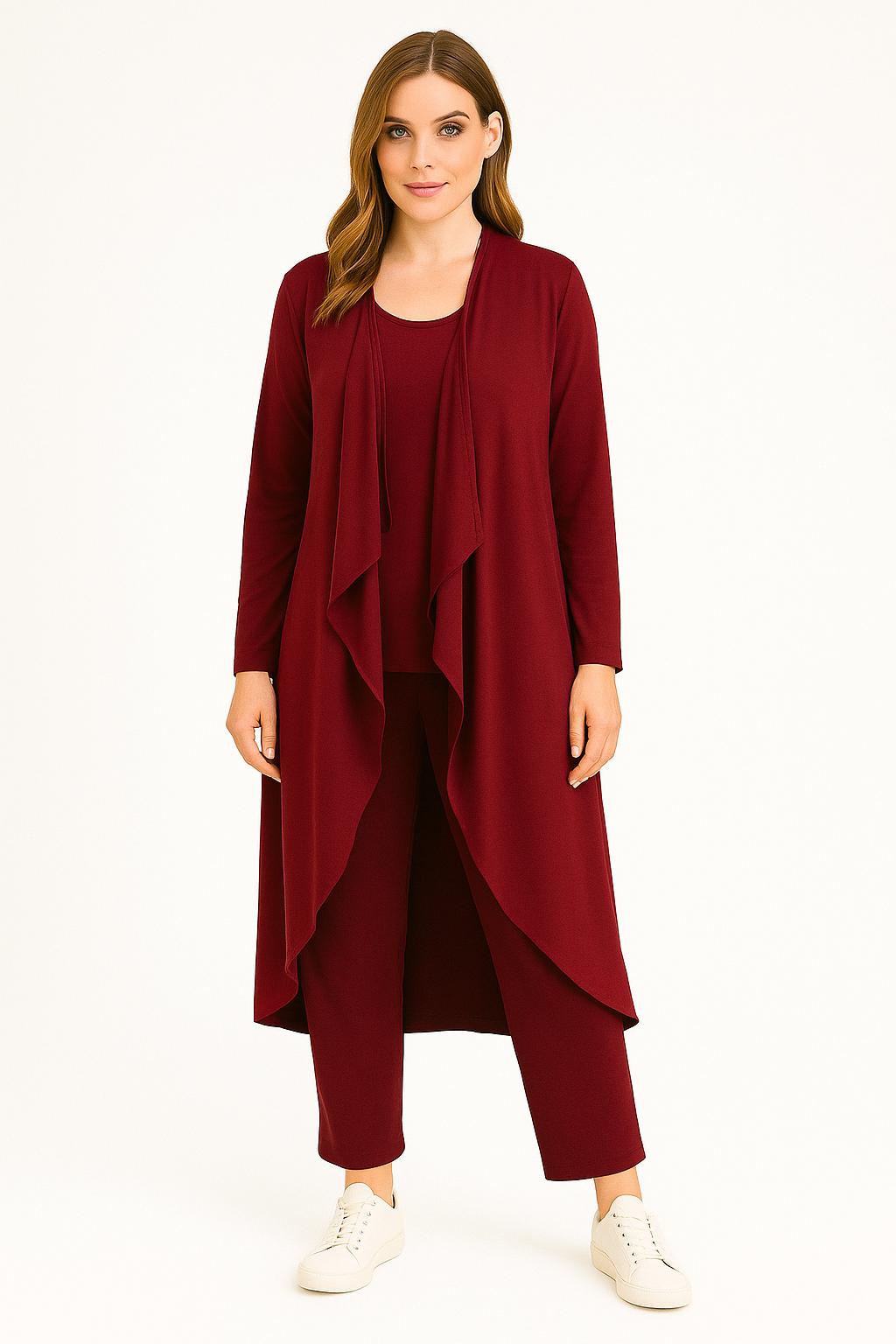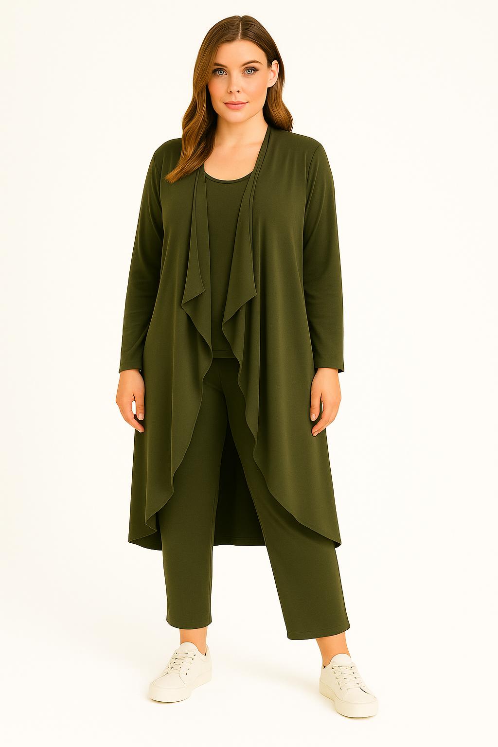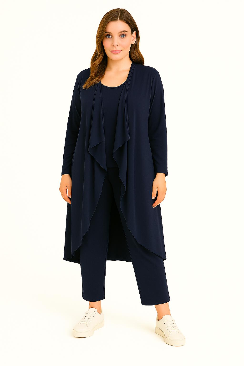 - Completo tre pezzi dalla 38 alla 60: pantalone con elastico in vita, maglia a manica lunga e spolverino lungo dal taglio elegante. Pratico e confortevole, perfetto per chi vuole unire comodità e stile. Versatile, puoi indossarlo sia di giorno per un look raffinato che la sera per un’eleganza senza sforzo. Un capo unico che valorizza tutte le taglie.