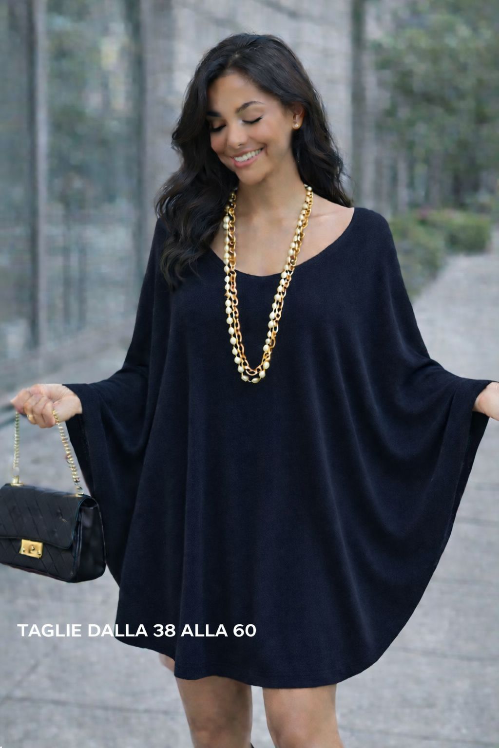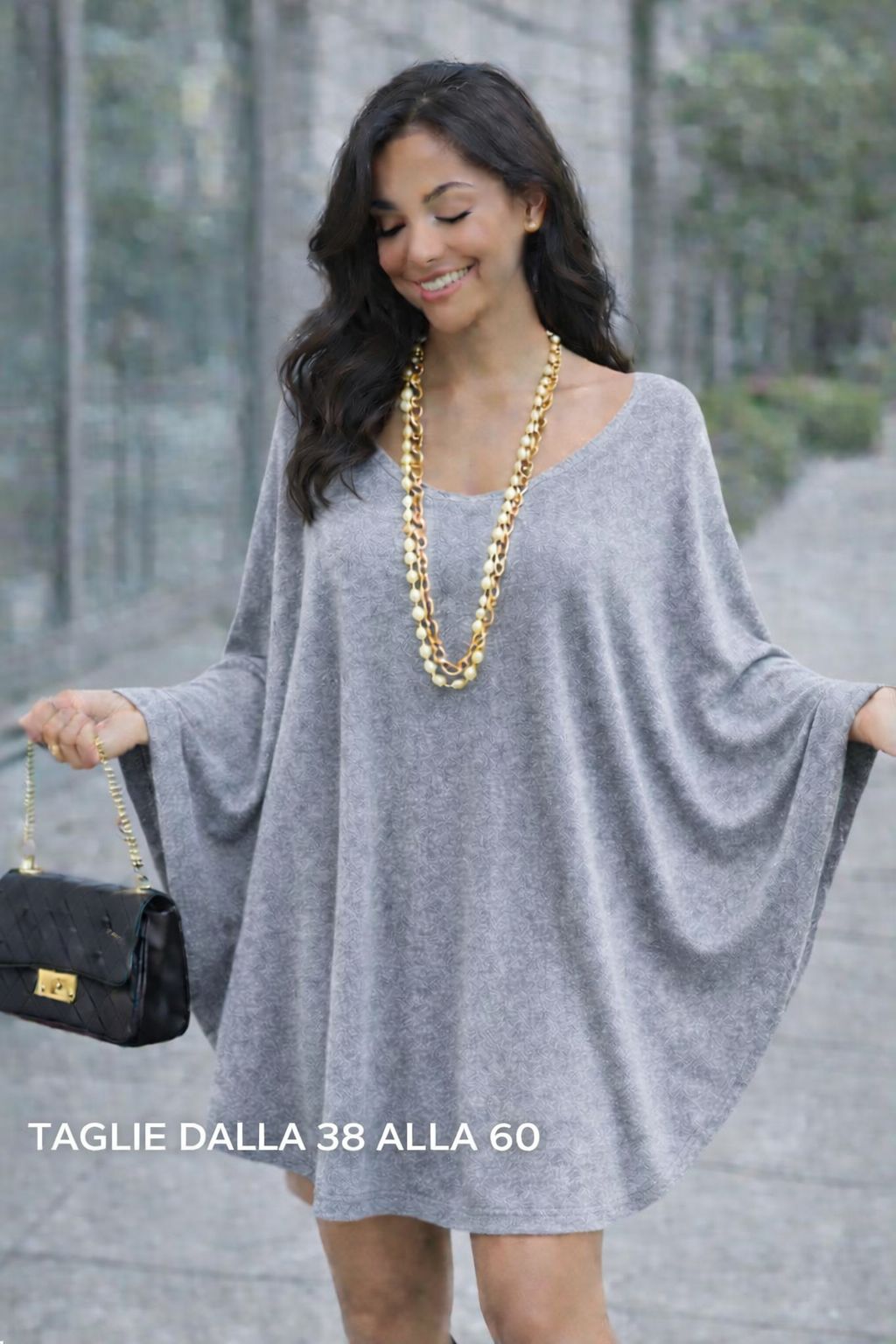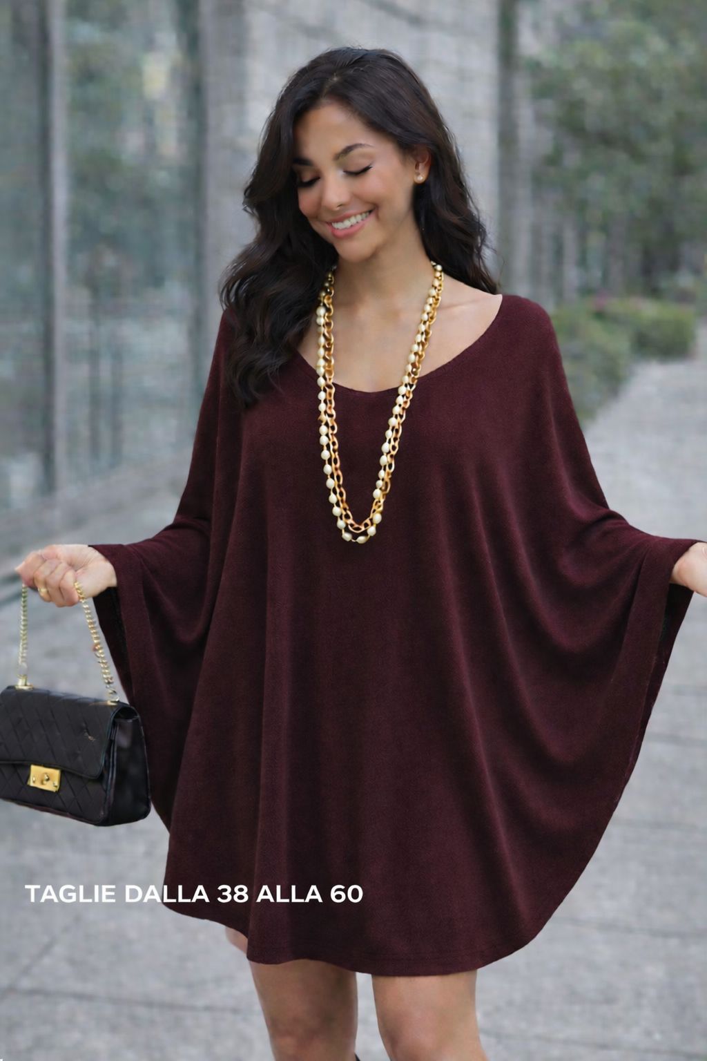 • Realizzata in tessuto caldo, fluido e piacevole al tatto, avvolge la figura con una vestibilità ampia e leggera, donando un look sofisticato senza rinunciare alla comodità.