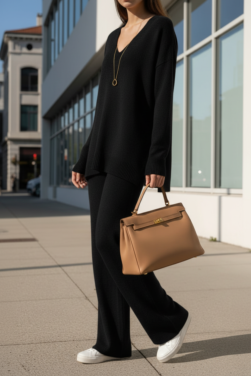 La maglia a scollo a V valorizza il décolleté con delicatezza, mentre i pantaloni ampi e soffici assicurano una vestibilità perfetta.