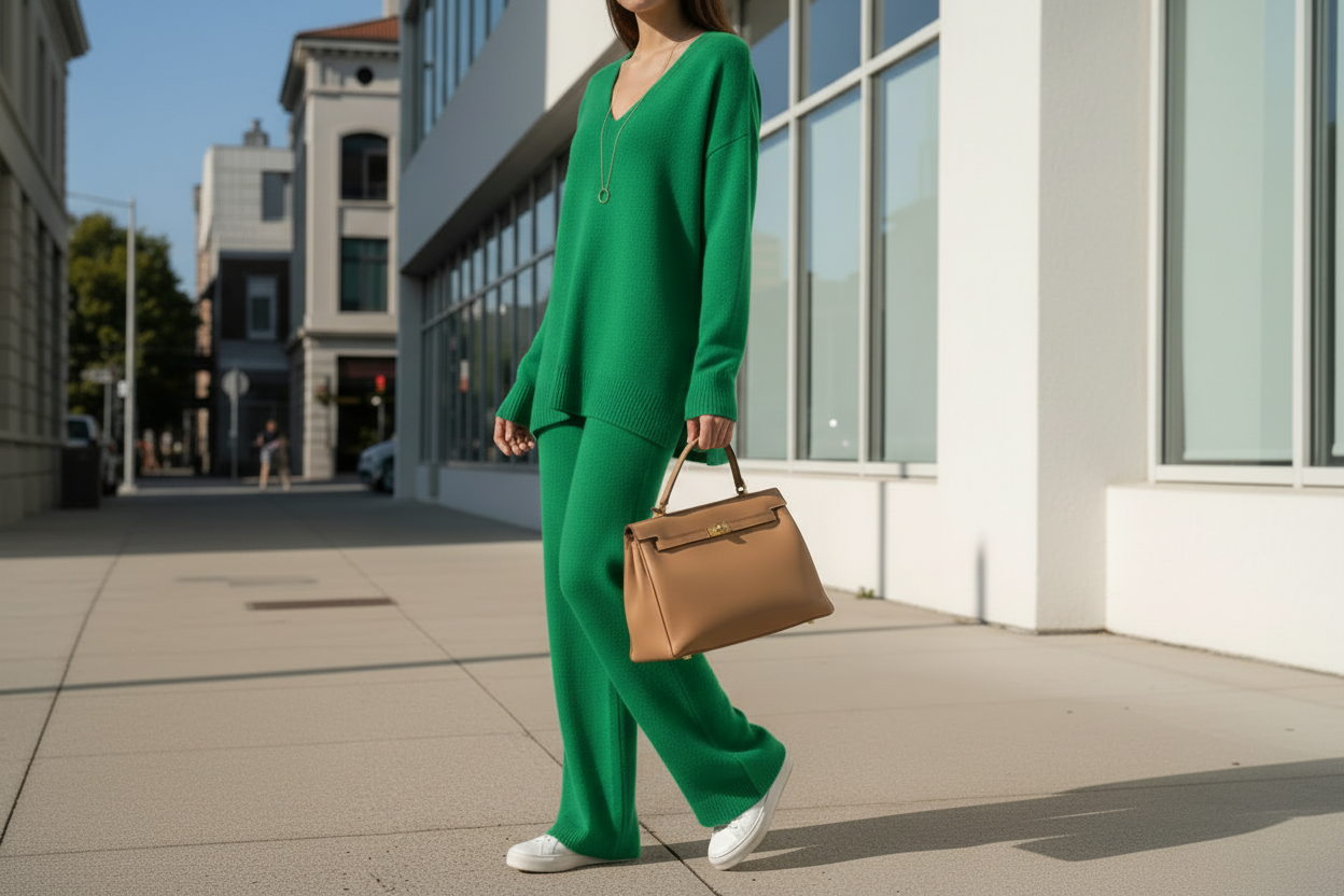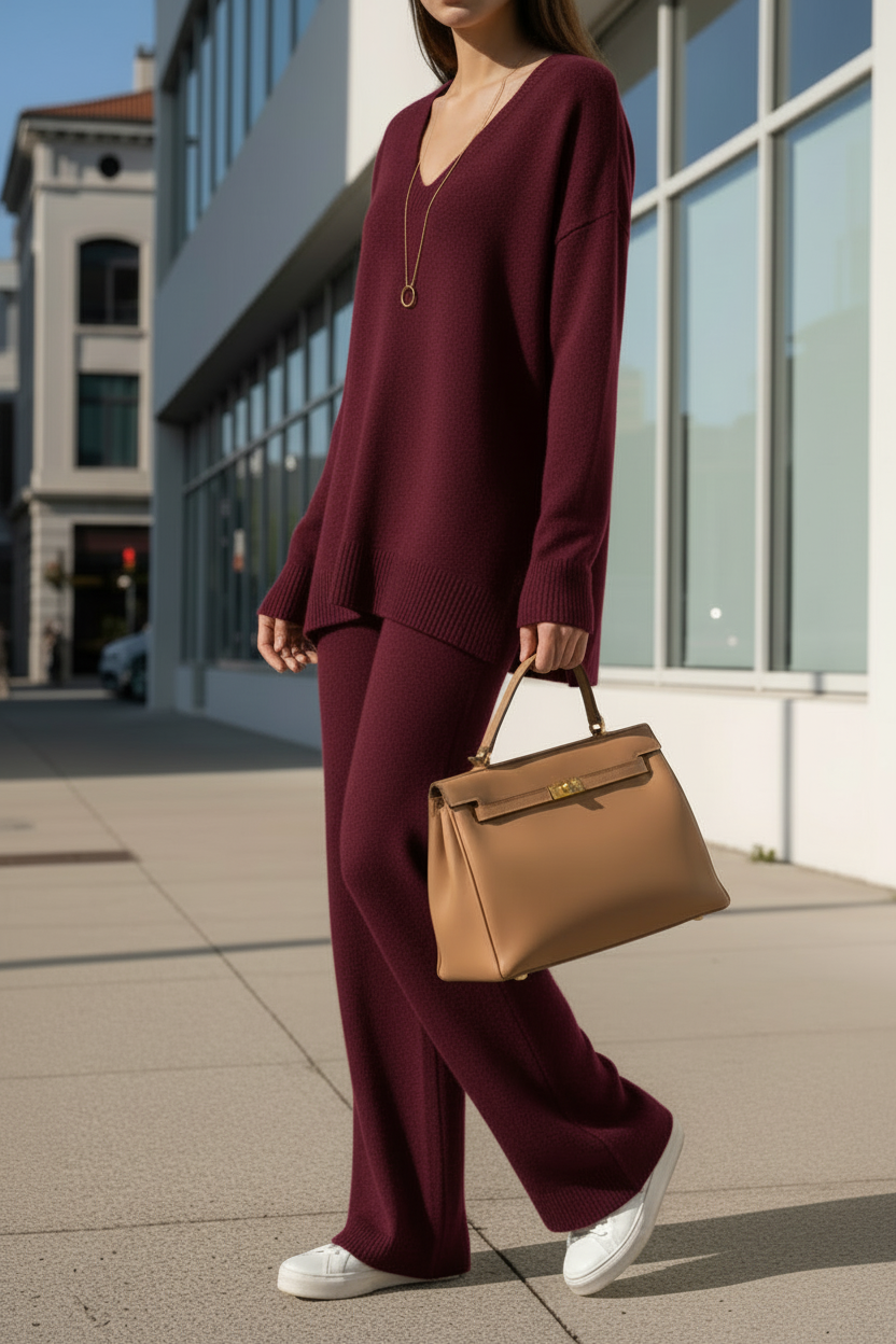 Questo completo due pezzi in lana è pensato per chi ama sentirsi comoda ma sempre curata.